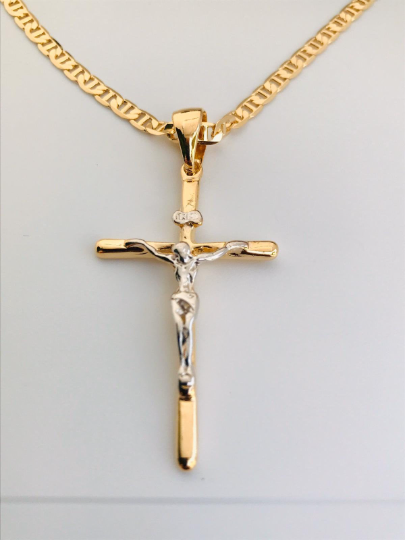 14K Gold Filled Big Cross Necklace Pendant Two Tone 48x28mm / Mens Cross Necklace / Cadena y Dije de Cruz