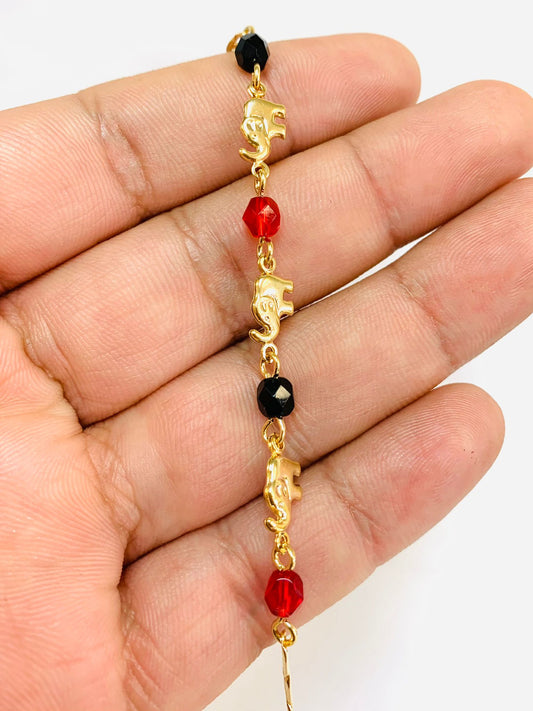 14K Gold Filled Black And Red Beads Elephant Bracelet / Good Luck Elephant Bracelet 7.5" / Pulsera Con Elefantes Para Mujer en Oro Laminado