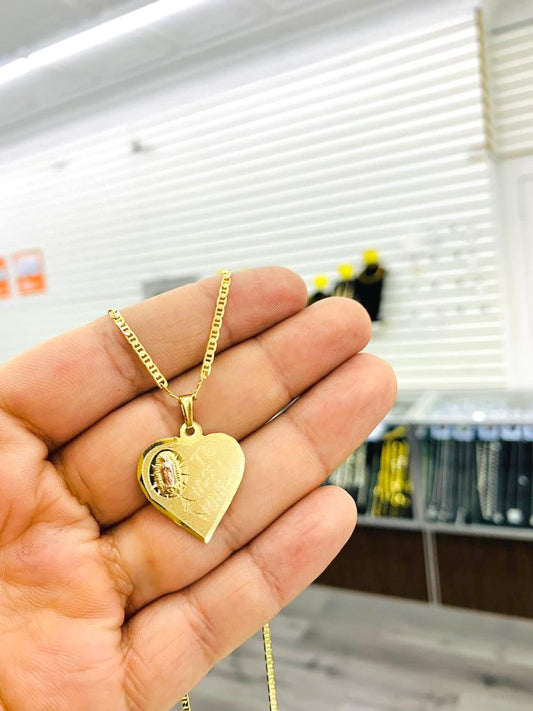 14K Gold Filled Our Lady of Guadalupe Pendant Necklace Mariner Chain Heart Charm Protection Mothers Day 24x22