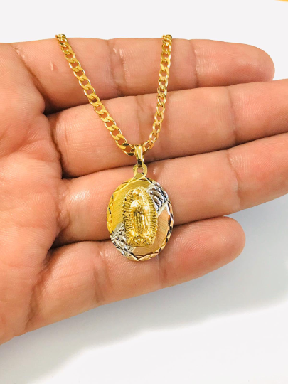 14K Gold Filled Our lady Of Guadalupe Necklace 24" Guadalupe Tri-Color Pendant 26x18mm / Cadena y Dije de La Virgen de Guadalupe Oro Laminado