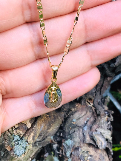 14K Gold Filled Tri-Color Guadalupe Necklace 20" Catholics Pendant 26x18mm , Dije de Guadalupe , Cadena Figaro Link, Regalos Navidad
