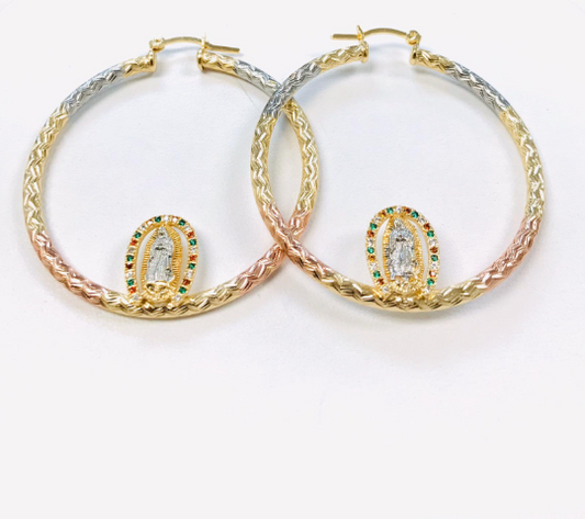 14K Gold Filled Virgen de Guadalupe Hoop Earrings 2x2", CZ Stones Mexican Flag