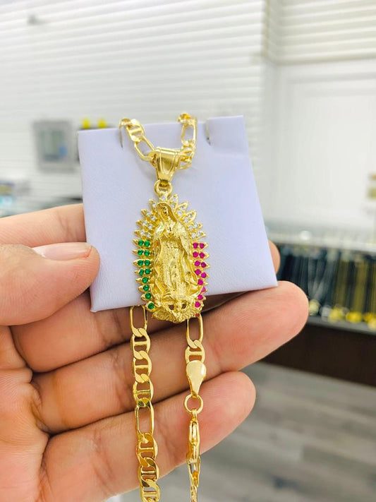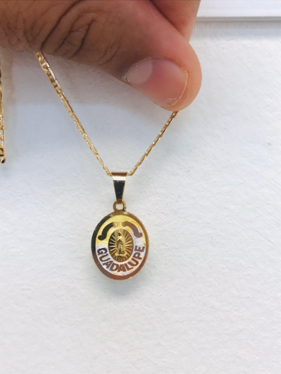 14k Gold Filled Virgen de Guadalupe Necklace / Mariner Link Chain Necklace 18” / Set Necklace & Pendant 20x14mm / Cadena y Dije de la Virgen de Guadalupe en Oro Laminado Para Mujer