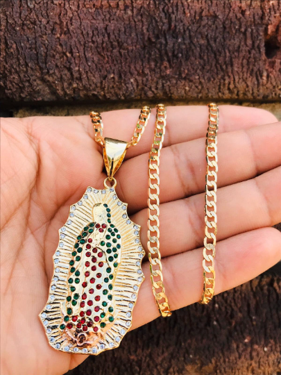 14K Gold Filled Virgen de Guadalpe Necklace 24” Pendant CZ Stones Mexican Flag 56x30mm
