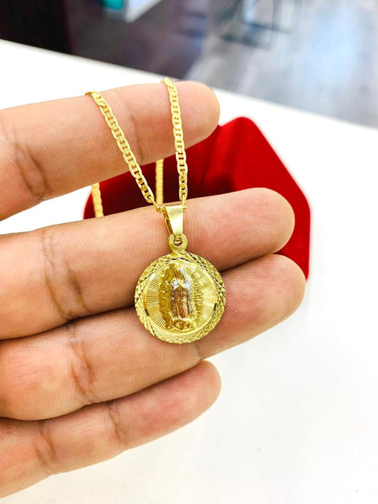 14K Gold Filled Virgen de Guadalupe Necklace Mariner Chain Round Medal Womens Baby 23x19