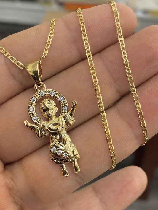 Cadena del Divino Nino en Oro Laminado para Mujer y Hombre/ Cadena Mariner Link con Dije Divino Nino / Baby Jesus Necklace for Womens GF 20"