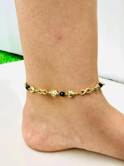 14K Yellow Gold Filled Heart Anklet Bracelet Black Stones 10"/Everyday Anklet Bracelet/Body Jewely/Womens Jewelry/Pulsera de Pie para Mujer