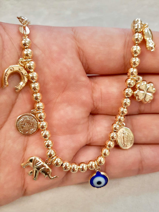 Good Luck Womens Bracelet Guadalupe San Judas Evil Eye Elephant Four Leaf Clover HorseShoe 7.5" 10g
