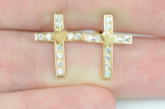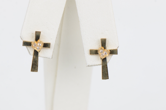 Cross Earrings Screw Back Heart CZ Stud Earrings in 14K Yellow and White Gold / Aretes de Cruz con Corazón Oro Real para Mujer / Womens Heart Earrings / Gold Stud Earrings