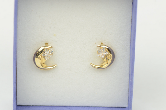 14K Yellow/White Gold Moon and Star Stud Earrings Screw Back