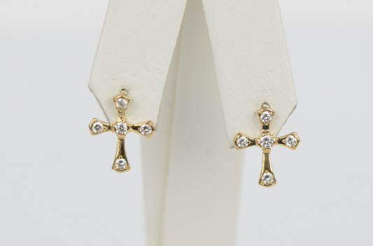 14K Yellow/White Gold CZ Beautiful Cross Dangle Earrings Screw Back Earrings