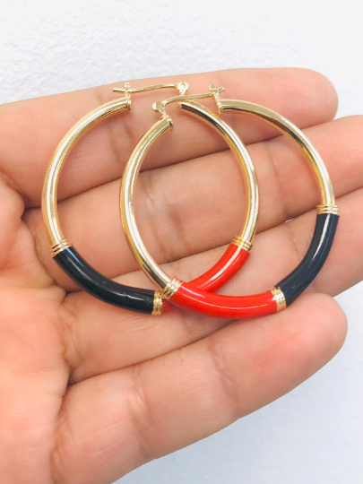Azabache Hoop Earrings, 14K Gold Filled Hoop Earrings, Gold Black And Red Hoops Earrings for Womens / Argollas Arracadas de Azabache Oro Laminado