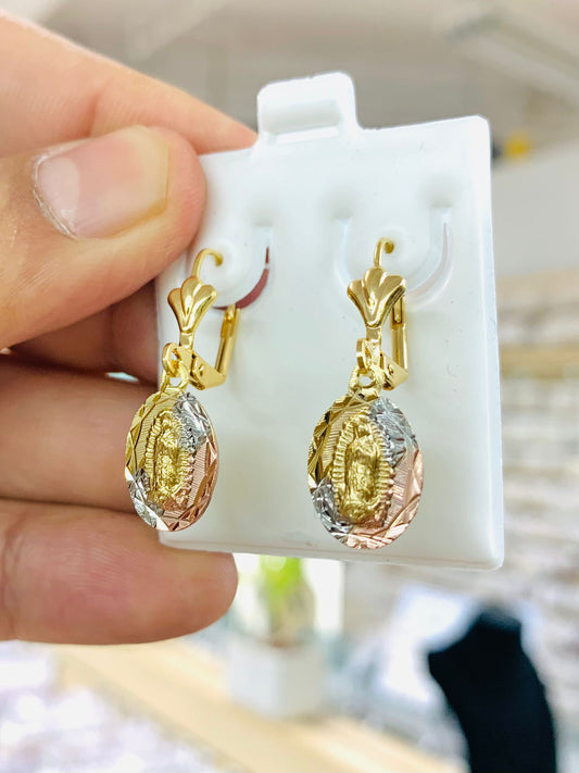 Tri color Virgen de Guadalupe Earrings Lever Back Gold Filled Ear Piercing Protection Jewelry Dangle Earrings 14x8mm