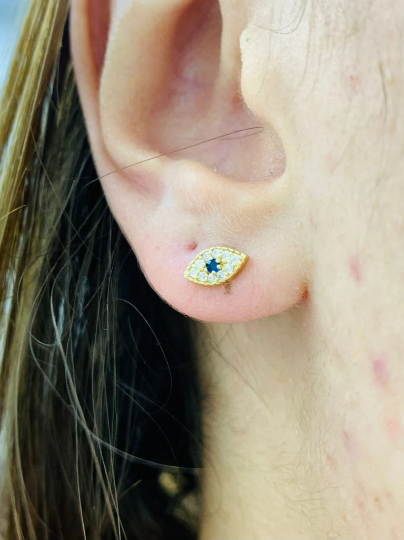 Dainty Evil Eye CZ Stud Earrings Screw Back 14K Yellow Gold 4x8mm for Women's Sapphire Stones Earrings for Everyday Aretes de Ojo Turco Oro