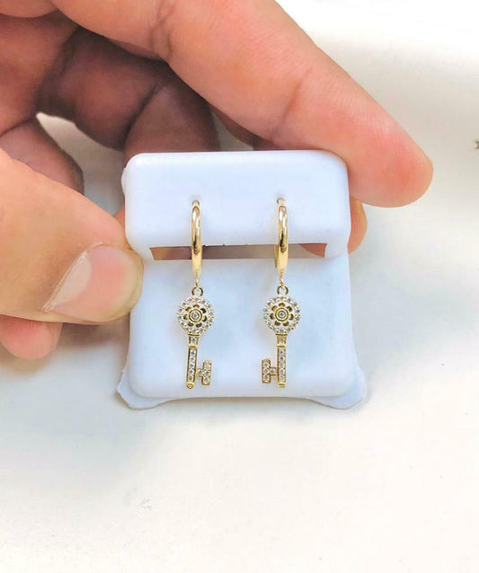 14k Yellow Gold Lock & Key CZ Dangle Drop Earrings 28x18mm