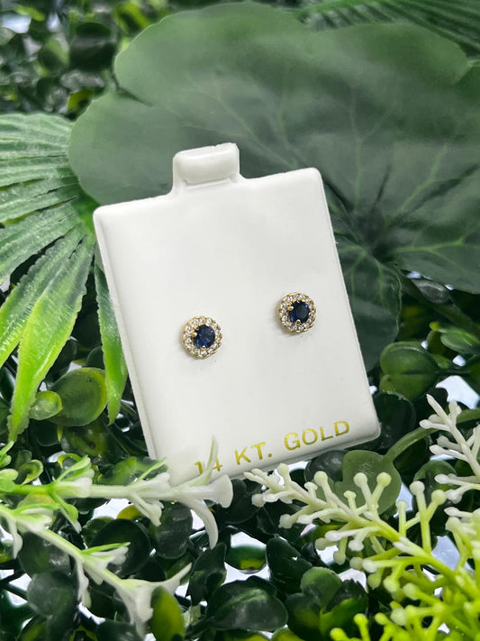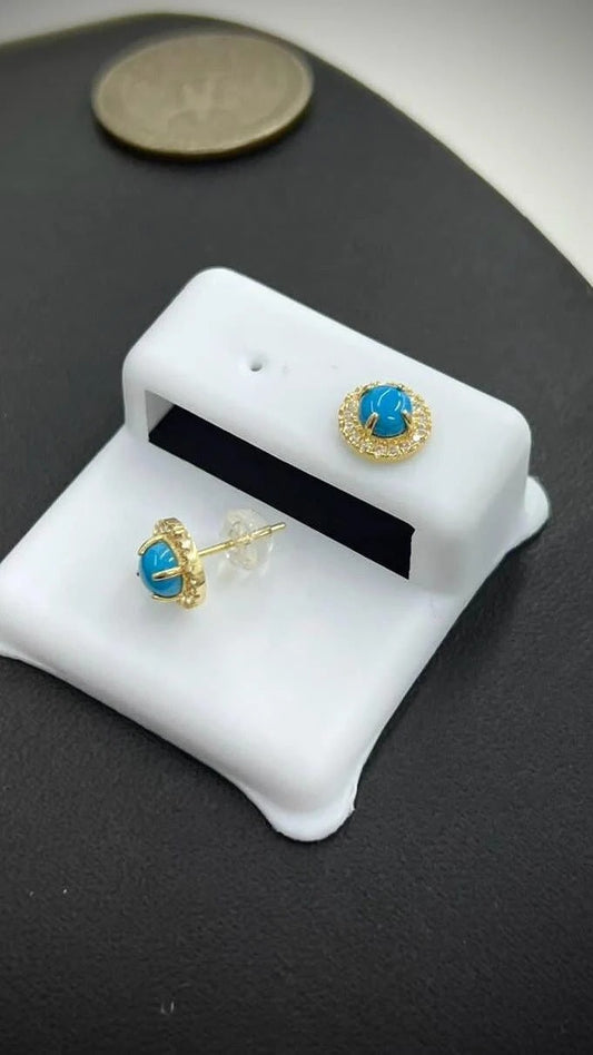 14K Yellow Gold Stud Minimalist Earrings Blue Opal CZ For Womens & Girls