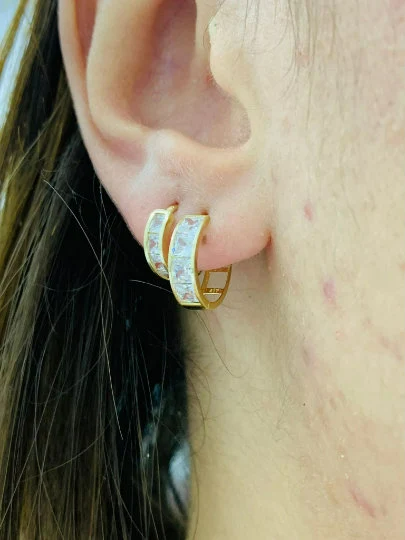 CZ Huggies Hoop Earrings in 14K Solid Gold for Womens Everyday Earrings Set Double Earrings Dainty CZ Earrings/ Argollas de Oro Solido Mujer