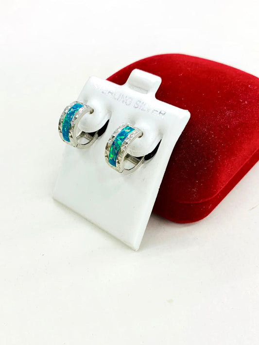 925 Sterling Silver Opal Blue Green Huggies Hoop Earrings 13mm Womens Gifts Fancy Jewelry