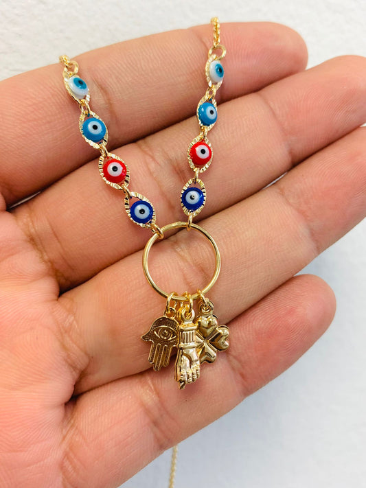 Good Luck Necklace / Evil Eye Necklace / Evil Eye Hand Necklace 16" / Four Leaf Clover Necklace / Cadena para la Buena Suerte