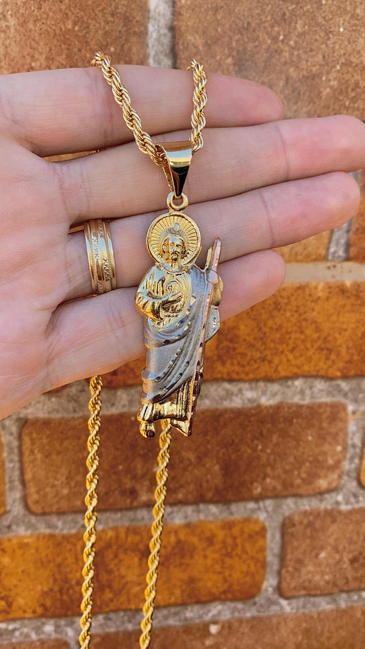 San Judas Necklace Pendant / San Judas Medalla 2.3x1” 24" / Saint Jude Necklace Set / Cadena y Medalla De San Judas En Oro Laminado