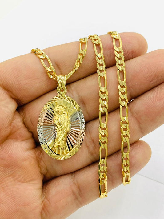 San Judas Necklace Figaro Chain Saint Jude Pendant Christian Charm 20" Gold Filled Women's Protection