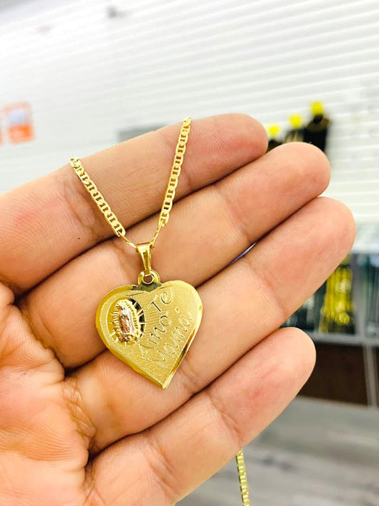 Virgen de Guadalupe Pendant Necklace 20" Heart Yellow Gold Filled I Love You Charm 24x22 Mothers Day Gift