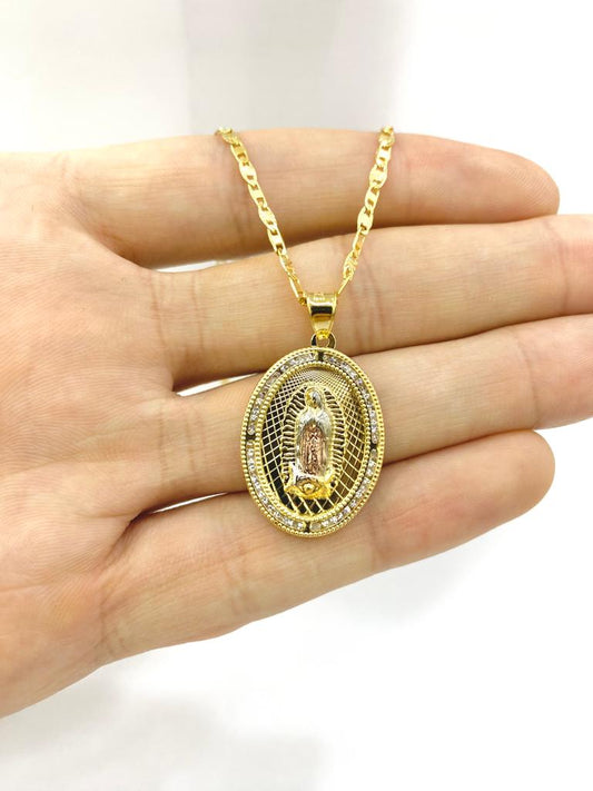 Virgen de Guadalupe Round Necklace with Box Link Chain 20" / Tri Color Guadalupe Pendant 17x14mm / Womens Guadalupe Necklace / Cadena Box Link con Dije de Guadalupe Oro Laminado