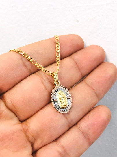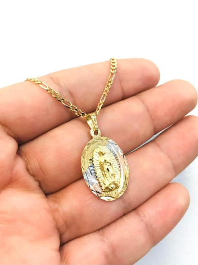 Virgen de Guadalupe Necklace Tri Color Diamond Cut 20x13mm With Figaro Link Chain 20" / 14K Gold Filled Everyday Necklace / Dije de la Guadalupe