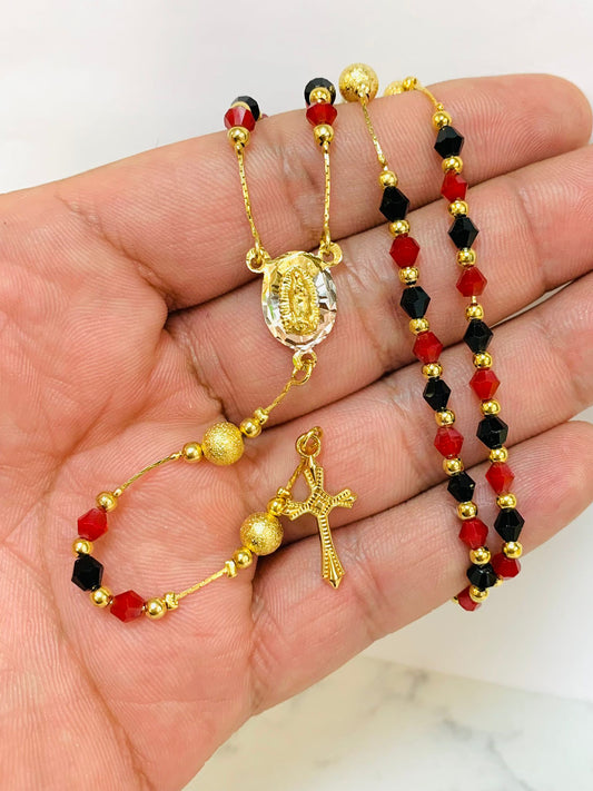 Virgin of Guadalupe Rosary 24" / Gold Filled Rosary / Black Red Beads Rosary / Rosary Chain for Womens / Catholics Jewelry / Rosario de la Guadalupe