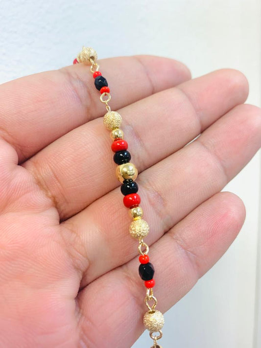 Women's Black And Red Azabache Bracelet / Beads Gold Filled Azabache 7.5" Christmas Gift / Pulsera de Azabache Para Mujer Bolitas Negras y Rojas / Pulsera Buena Suerte
