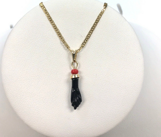 14K Yellow Gold Filled Azabache Necklace For Protection 16" 18" 20" Inches / Azabache Hand Pendant with Mariner Link Chain / Cadena y Dize de Azabache Para la Proteccion