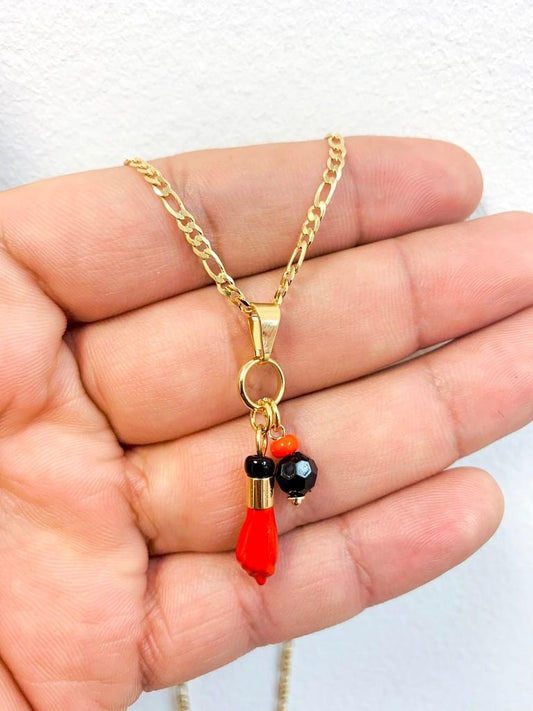 18K Gold Filled Black Bead Red Azabache Necklace Figaro Chain 20" for Womens Good Luck & protection Jewelry / Cadena Figaro Link con Dije de Azabache para la Proteccion