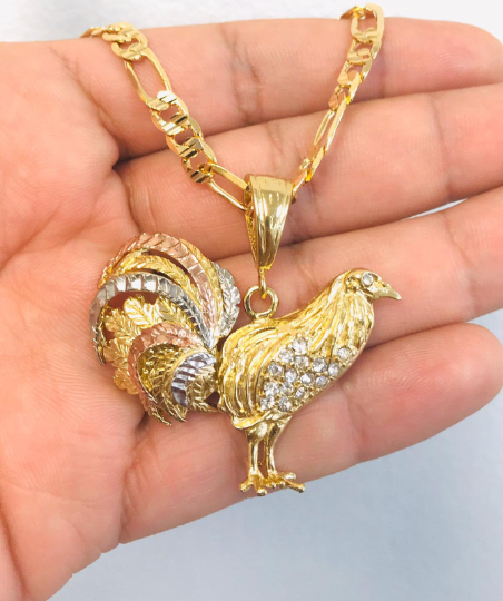 18K Gold Filled Chicken Rooster Necklace 24” Figaro Chain 33x45mm / Chicken Rooster Pendant Jewelry For Mens / Cadena y Dije de Gallo en OroHombre