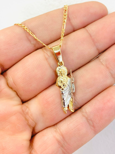 San Judas Tri Color Necklace Pendant Gold Filled / Figaro Link Chain Necklace / Everyday Necklace / Saint Jude Necklace for Womens 20" / Caddena y Dije de San Judas