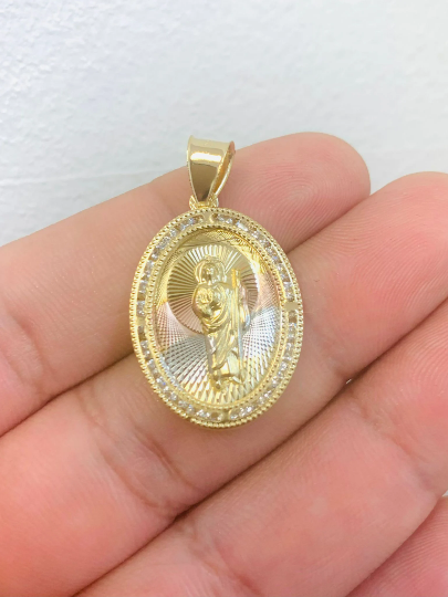 14K San Judas Pendant with CZ Stones Around Tri Color 28x20mm / Saint Jude Pendant for Womens Mens / Dije del San Judas Tres Colores de Oro Laminado