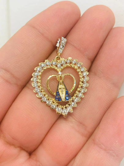Pingente da Virgem de Aparecida em Oro Foleado para Mulheres / Pingente de Coração da Padroeira do Brasil com Pedras de Zirconia ao Redor