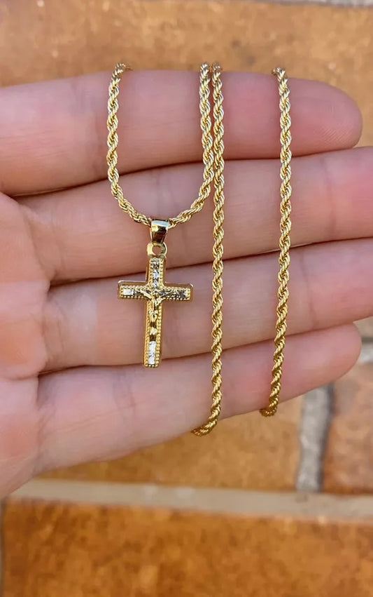 CZ Minimalist Cross Necklace Gold Filled Crucifix Pendant 24x14mm Rope Chain 18"