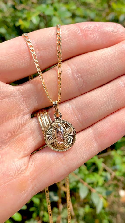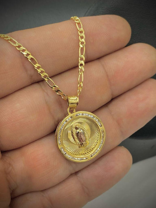 Virgen de Guadalupe Necklace Round CZ Pendant 23x20mm 14K Gold Filled Figaro Chain
