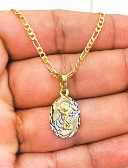 Divino Niño Necklace Pendant with Figaro Link Chain Gold Filled Dainty Tiny Necklace 20" Dije Tres Oros Del Divino Niño Baby Jesus Necklace 20x13mm