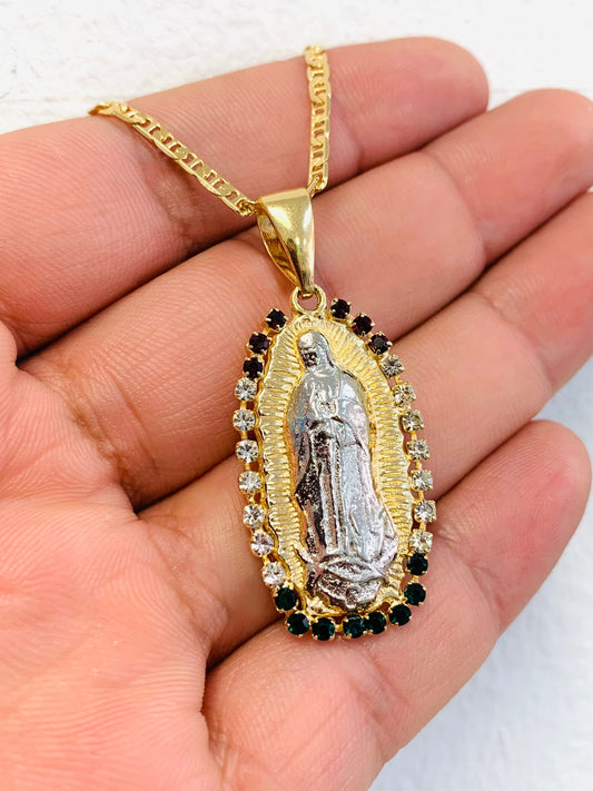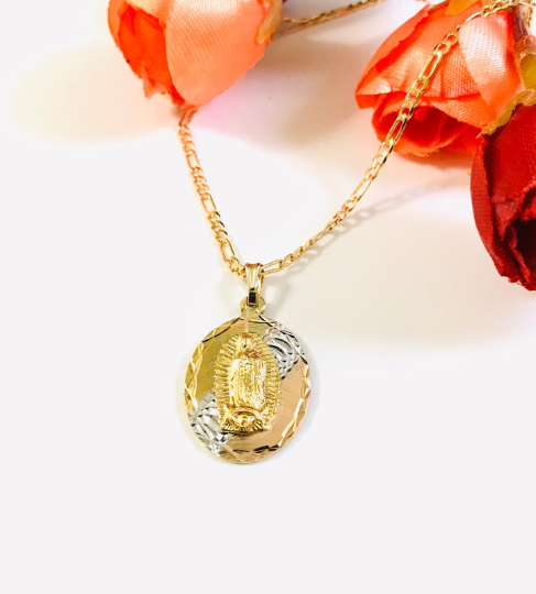 Virgen de Guadalupe Necklace Tri Color Diamond Cut 20x13mm With Figaro Link Chain 20" / 14K Gold Filled Everyday Necklace / Dije de la Guadalupe