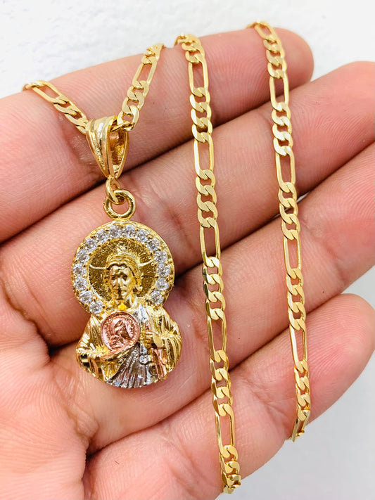 CZ Tri Color San Judas Necklace Pendan Figaro Link Chain 22" For Womens / Cadena Dije San Judas