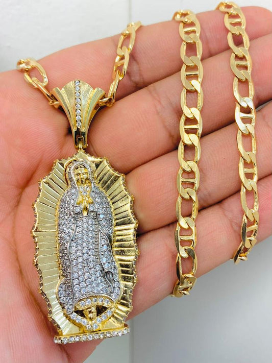 14K Gold Filled Tri-Color Guadalupe Necklace 20" Catholics Pendant 26x18mm , Dije de Guadalupe , Cadena Figaro Link, Regalos Navidad