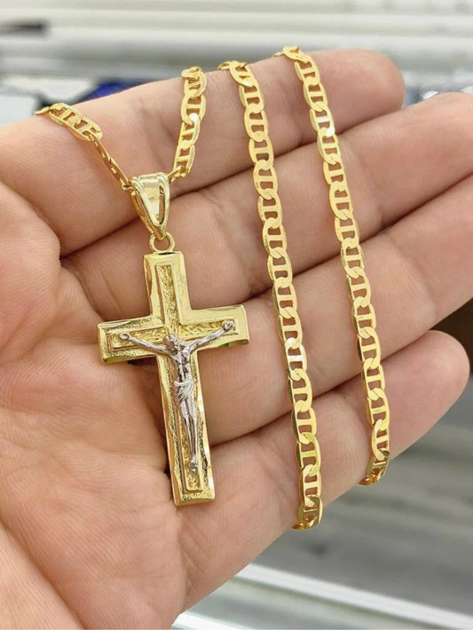 Big Cross Curb Chain Necklace 14K Pendant 24" Cadena de Cruz Jewelry Catholics For Mens