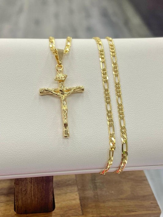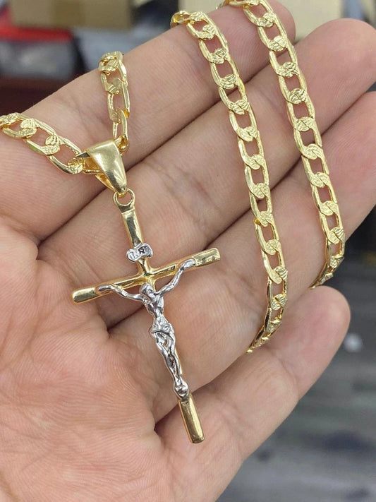 14K Yellow GF Rustic Cross Necklace Figaro Chain 24" Catholics Crucifix Jewelry Gifts For Mens Boys