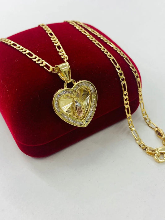 Virgen de Guadalupe Necklace Pendant CZ Heart Tri Color Link Figaro 18" Dije Guadalupe Tres Oros