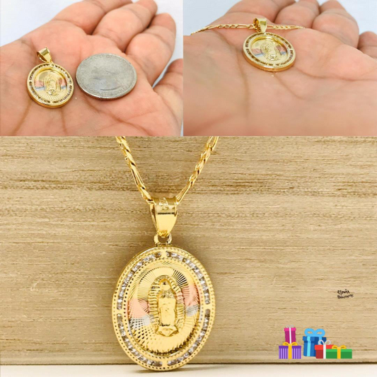 14K Gold Filled Virgen de Guadalupe Pendant Necklace 24x18mm CZ Stones Pendant / Dije de Guadalupe y Cadena Figaro Link