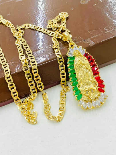 CZ Virgen de Guadalupe Necklace Mexican CZ Stones Pendant 44x20 in Gold Filled Guadalupe Charm Pendant Mariner Link Chain Dije de Guadalupe