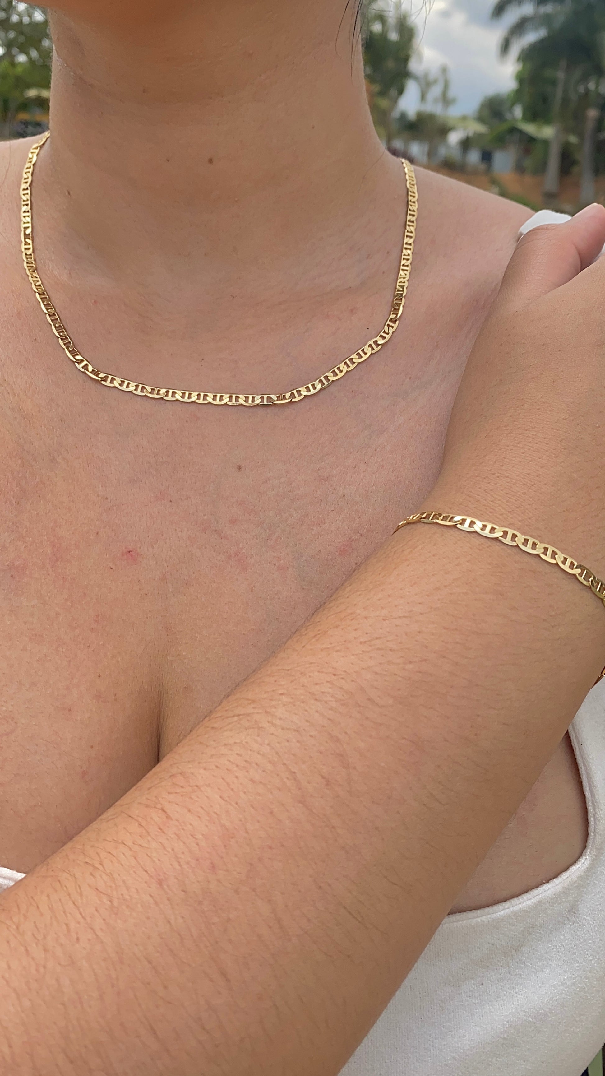 This stunning jewelry set includes a 20" mariner link chain necklace and a matching 7.5" bracelet, both crafted in a sleek 3.8mm design. Perfect for women and girls, this set makes an elegant gift for any occasion, especially bridal events. The timeless gold finish adds sophistication and charm to any outfit. Ideal for everyday wear or special moments.