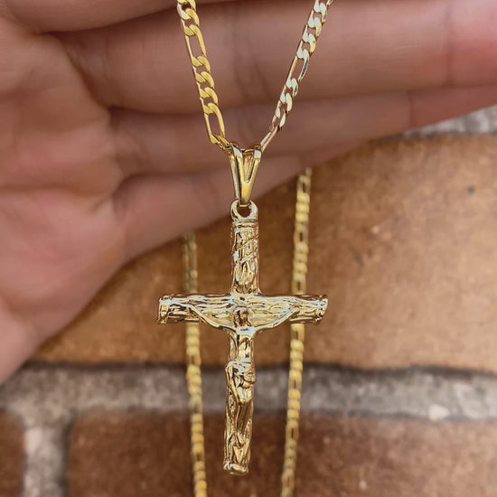 14K Gold Filled Rustic Cross Necklace for Mens Womens Figaro Chain 2.5mm Elegant