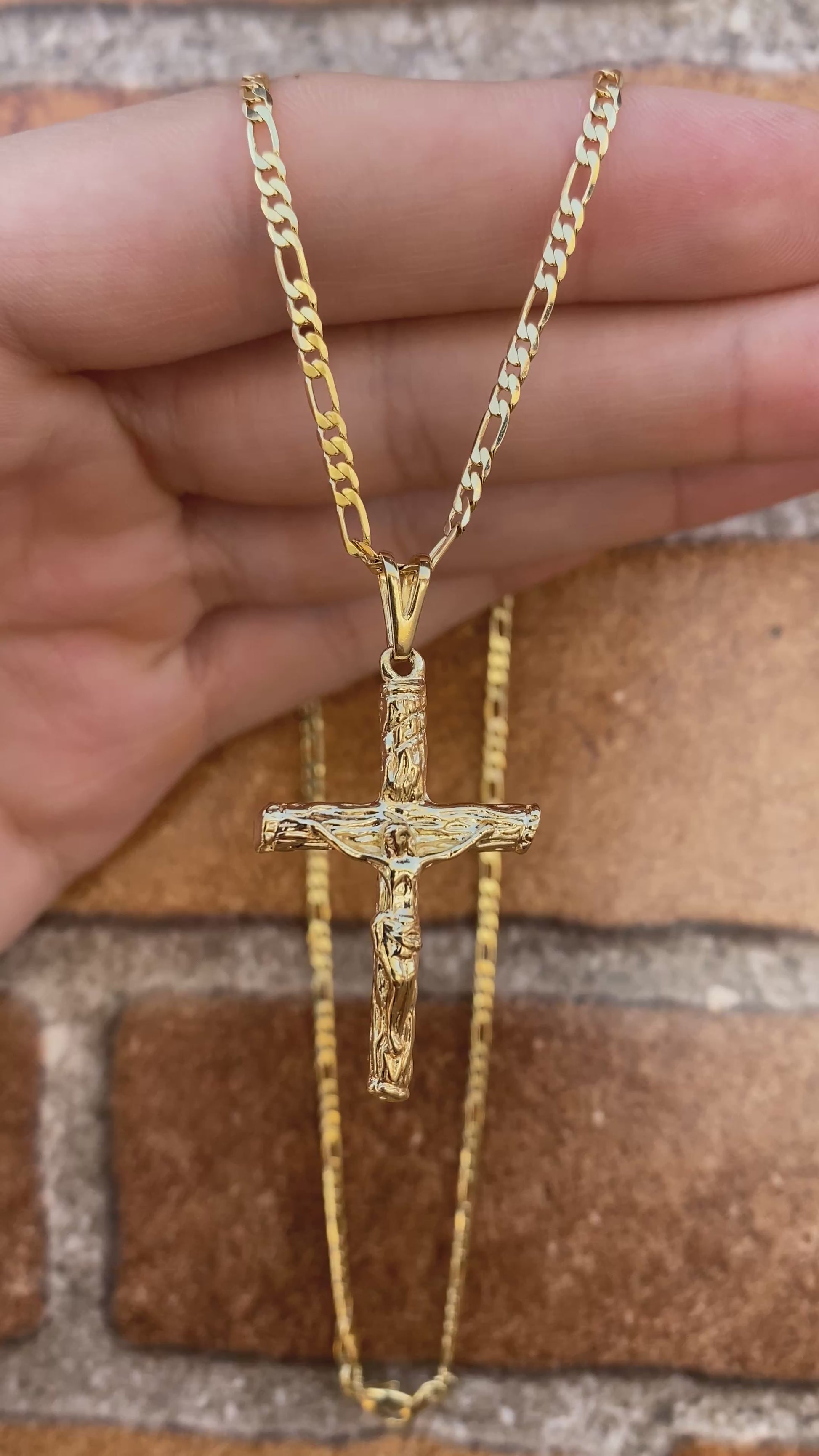 ✨ 14K Yellow Gold Filled Rustic Cross Necklace for both men and women. This necklace features a Figaro Flat Link Chain measuring 2.5mm, available in 20" and 24" lengths. Perfect for everyday wear, it's a big crucifix charm that adds a touch of faith to your style. Ideal for anniversaries or birthdays.